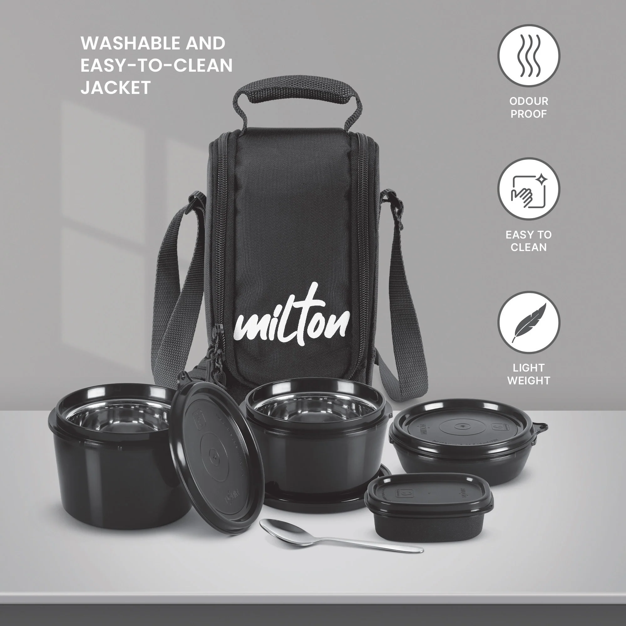 • Microwaveable leak-proof containers with steel inner.